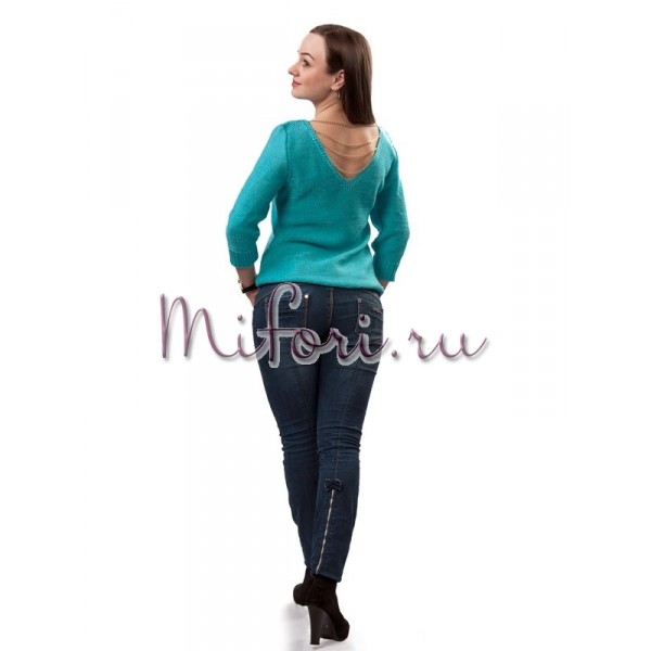 Оригинальный вязаный пуловер с рукавами 3/4 и V-образным вырезом. По спинке вырез декорирован цепочкой. Выполнен из пряжи приятной к телу и удобный.