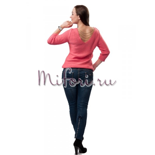 Оригинальный вязаный пуловер с рукавами 3/4 и V-образным вырезом. По спинке вырез декорирован цепочкой. Выполнен из пряжи приятной к телу и удобный.