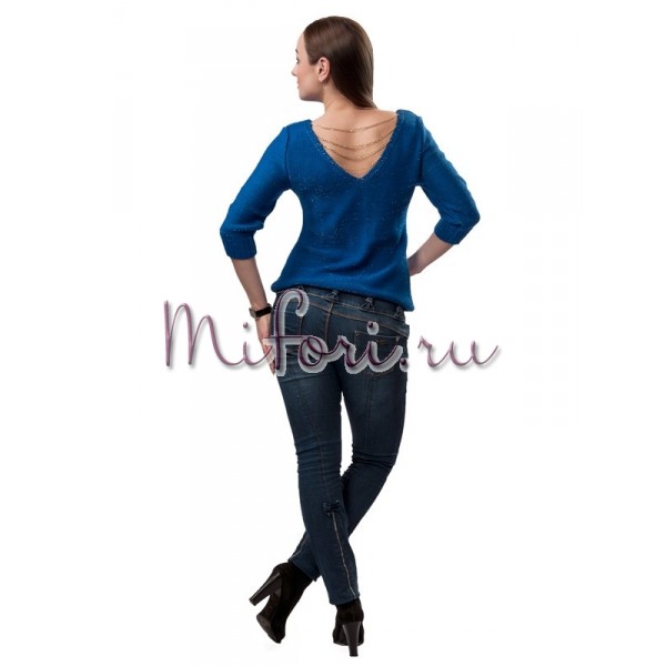 Оригинальный вязаный пуловер с рукавами 3/4 и V-образным вырезом. По спинке вырез декорирован цепочкой. Выполнен из пряжи приятной к телу и удобный.