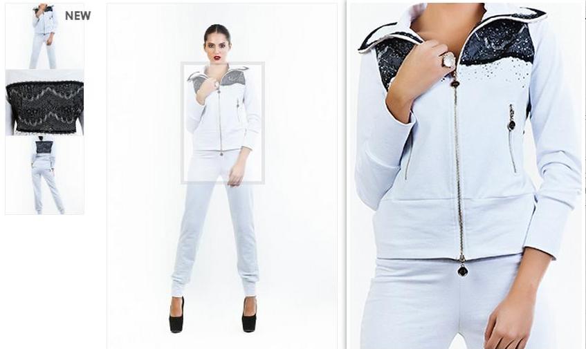 Трикотажный белый костюм, декорированный гипюром по полочке и по центру спинки кофты. Кофта идет на замке с 2-мя карманами. Брюки заужены к низу с накладными карманами на замках.