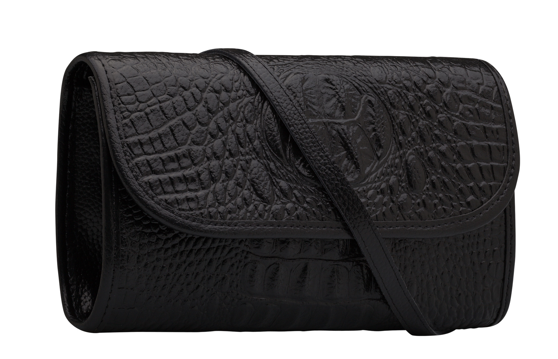 Клатч имеет два отделения, два кармана на молнии и кармашек для мелочей. Сзади есть карман на молнии. В комплект входит длинный ремень и короткий на руку.