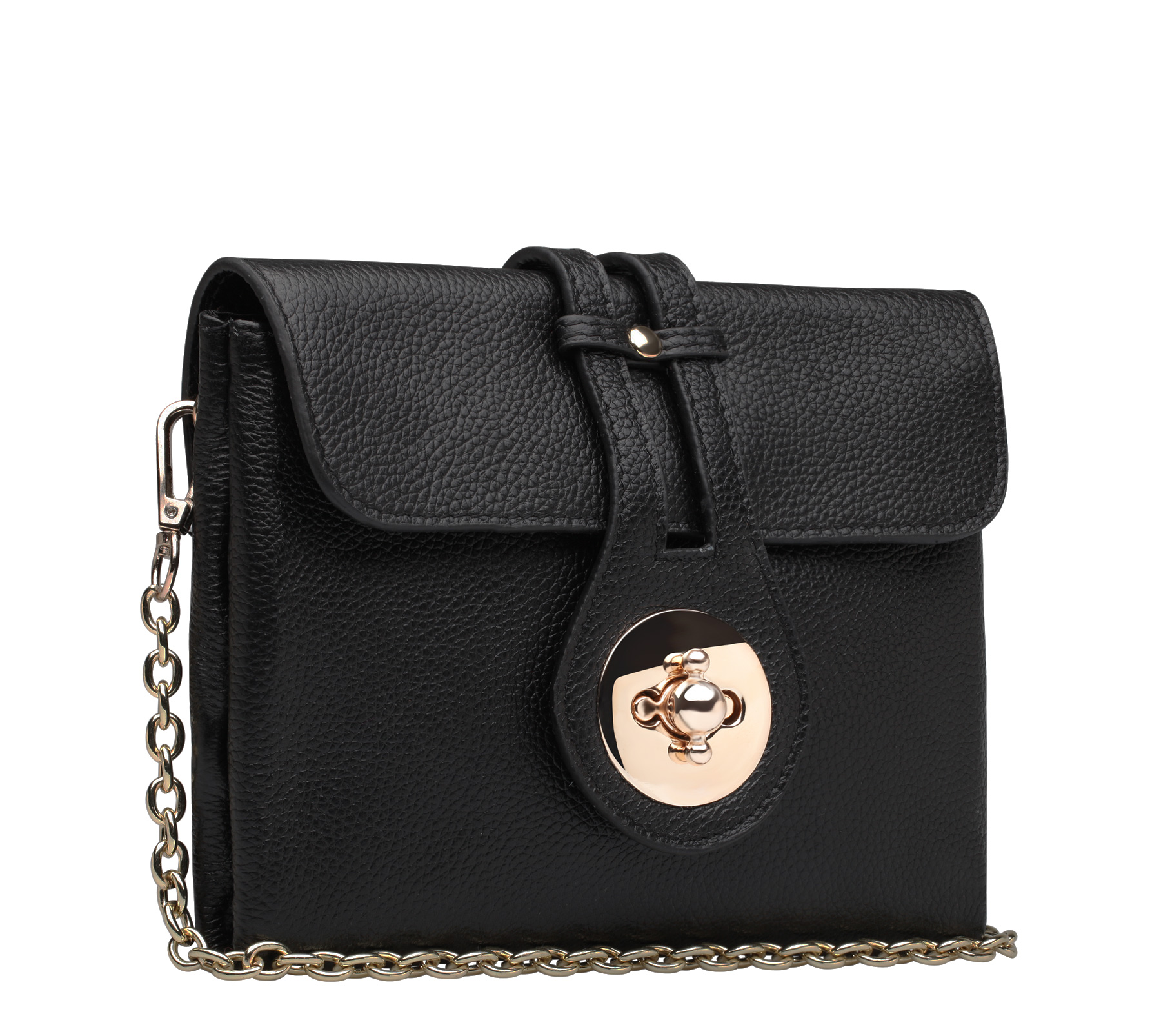 Клатч закрывается на оригинальный замок. У клатча есть кожаный ремешок на запястье и длинная металлическая цепочка. Внутри карман на молнии, кармашек для телефона и кармашек для мелочей. Подклад коричневый.