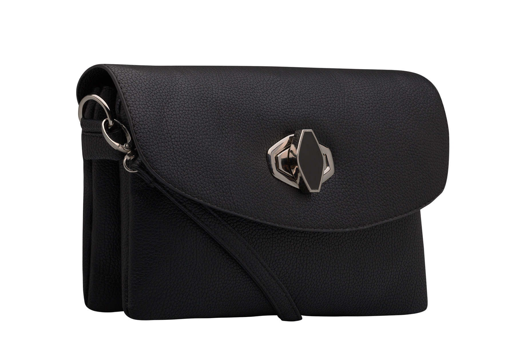Закрывается на замок. Внутри два отделения на молниях. Внутри есть маленький кармашек на молнии и кармашек для мелочей. Сзади кармашек на молнии. Есть длинный ремешок и короткий на руку.