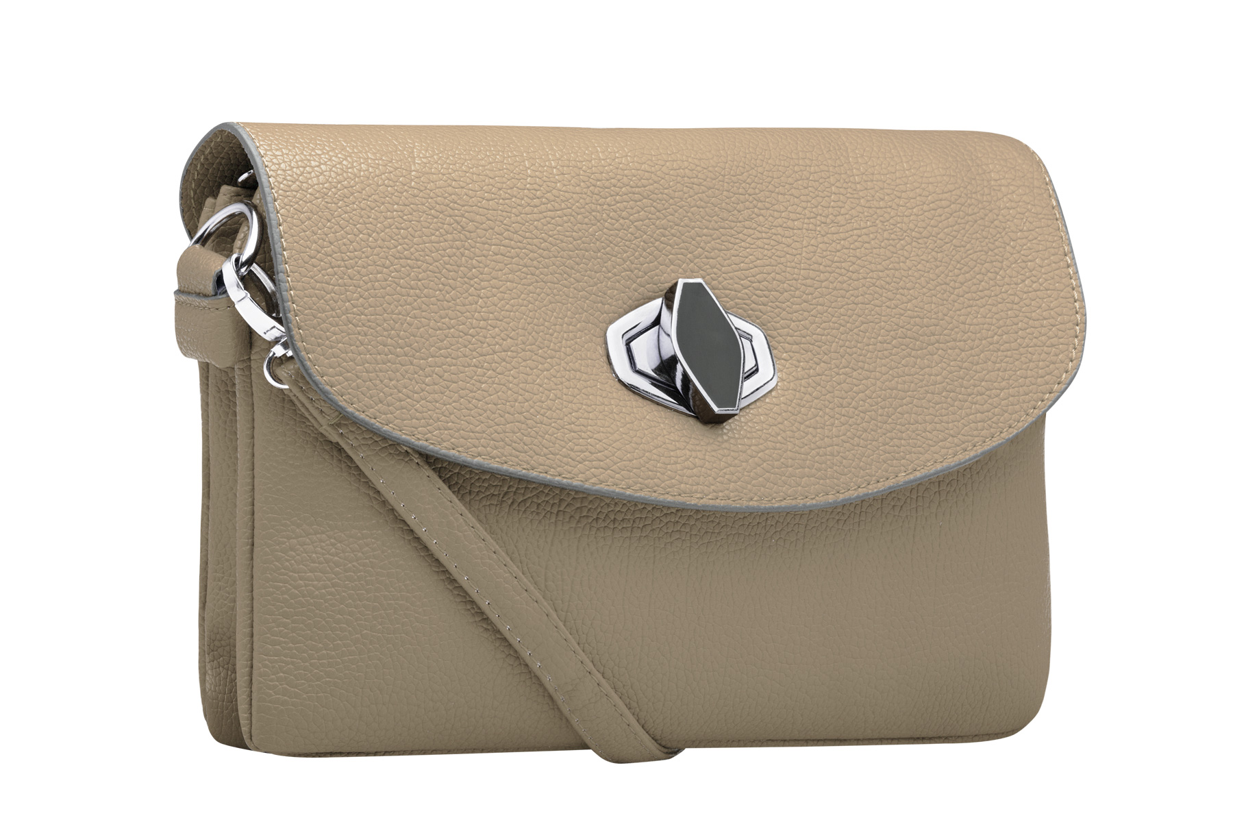 Закрывается на замок. Внутри два отделения на молниях. Внутри есть маленький кармашек на молнии и кармашек для мелочей. Сзади кармашек на молнии. Есть длинный ремешок и короткий на руку.