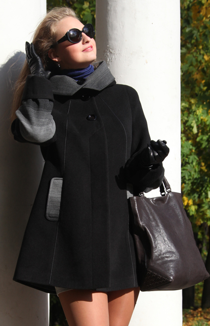 Элегантное укороченное пальто из плотной мягкой ткани с серой отделкой.