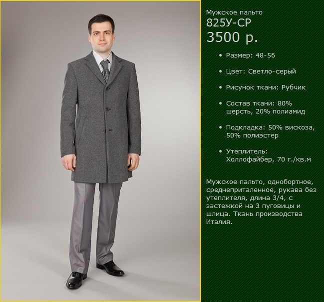 Мужское пальто, однобортное, среднеприталенное, рукава без утеплителя, длина 3/4, с застежкой на 3 пуговицы и шлица. Ткань производства Италия.
