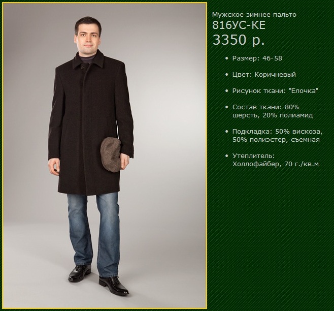 Элегантное утепленное пальто классического фасона с супатной (потайной) застежкой на 4 пуговицы и одной верхней прорезной петлей. Покрой предусматривает возможность ношения на пиджак, особенно эффектный вид при наличии галстука при расстегнутой верхней пуговице. Применена сложная технология формования плечевого пояса, свойственная пошиву мужского пиджака, что позволяет иметь четкие, ясные линии силуэта. Указанная технология заметно стройнит фигуру.