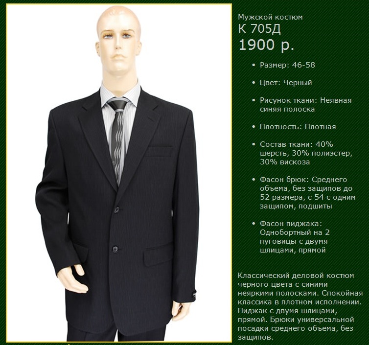 •Фасон брюк: Среднего объема, без защипов до 52 размера, с 54 с одним защипом, подшиты
