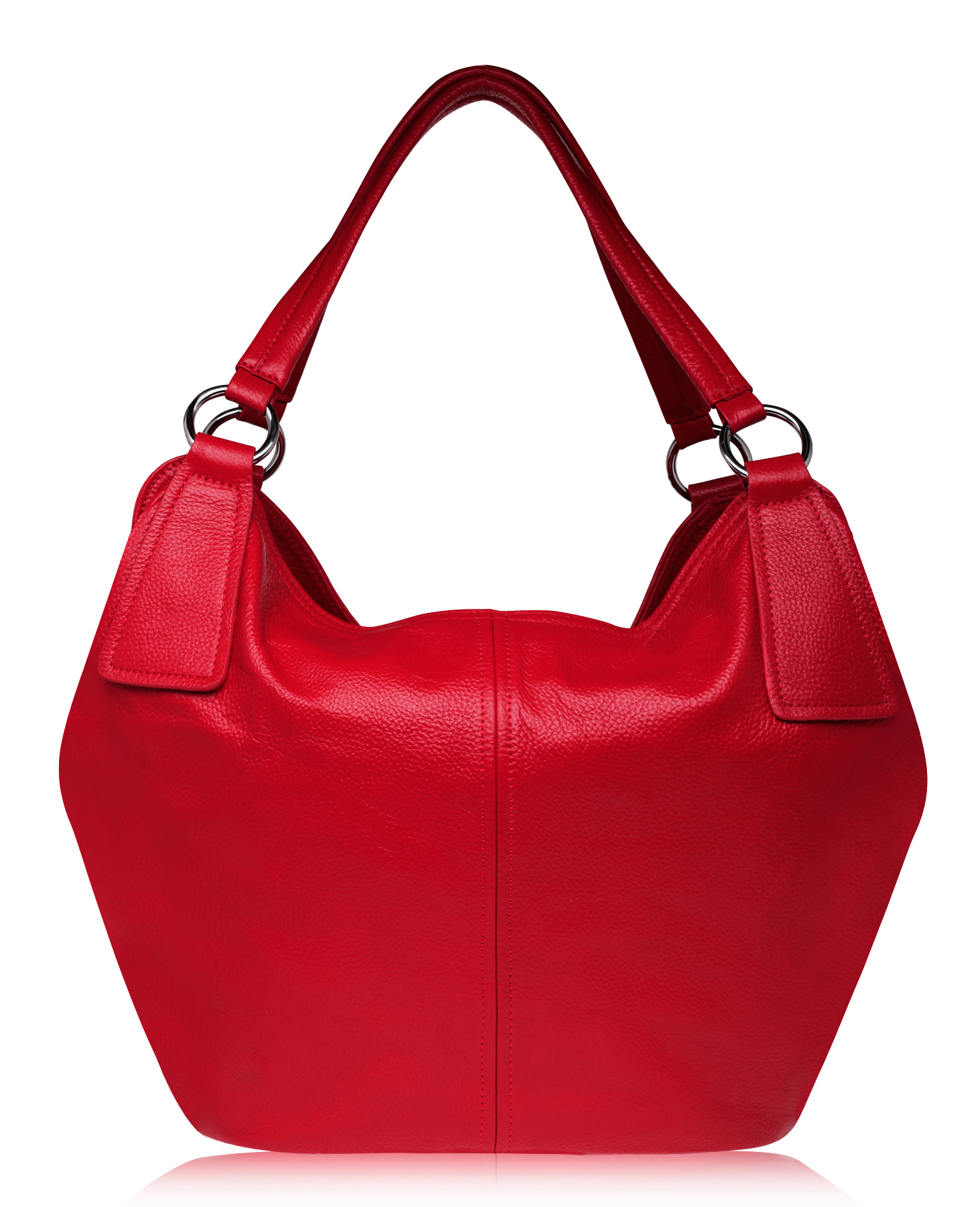 Женственная сумка из натуральной кожи. Необычная форма сумки делает ее одним из основных элементов вашего туалета. Спереди карман на молнии. Разъема ручек достаточно, чтобы носить сумку на плече даже на объемную верхнюю одежду.Цвет алый