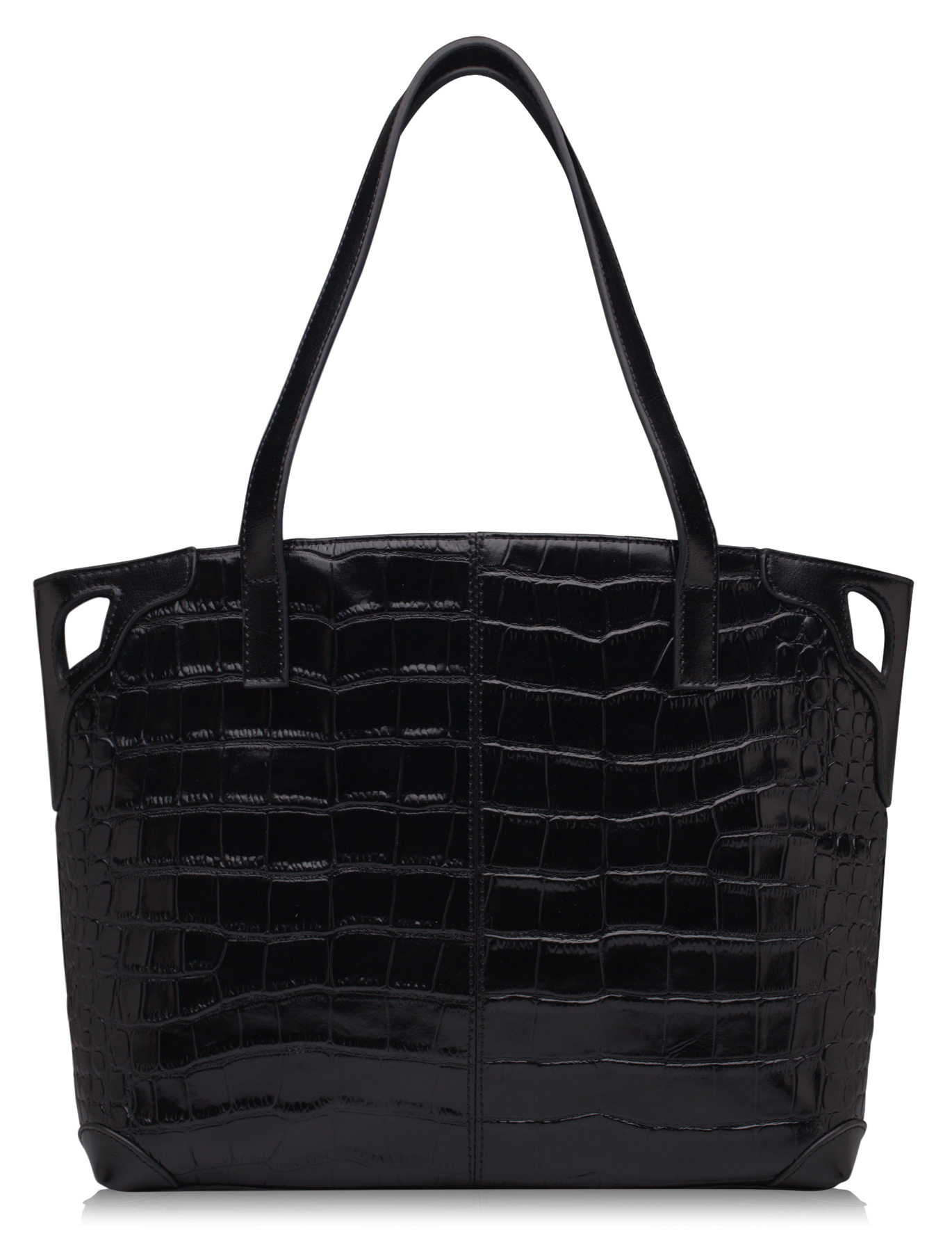 Женственная сумка из плотной натуральной кожи, имитирующей кожу крокодила. У этой модели очень удобный средний размер, вмещает формат А4 и при этом не выглядит большой. Большой плюс этой сумки в том, что она смотрится абсолютно уместно в будние дни в офисе, и в выходные на встрече с друзьями. Разъема ручек достаточно, чтобы носить сумку на плече.