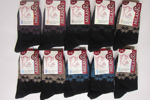 Женские шерстяные носки производятся из шерсти ангоры с добавлением хлопка и эластана. В упаковке 10 пар женских носков.