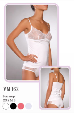 Хлопковая женская майка на тонких бретельках, с V-образным вырезом отделанным ажурной тканью над грудью. На майке обозначена грудь, под грудью один шов.