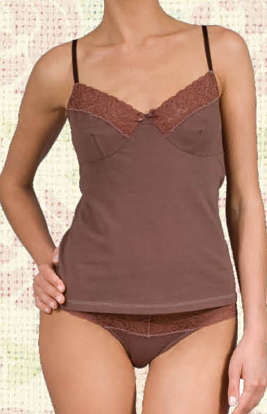 Майка на тонких бретельках. На майке обозначена грудь, под грудью один шов.Декольте майки выполнено из кружева в крупные цветы.