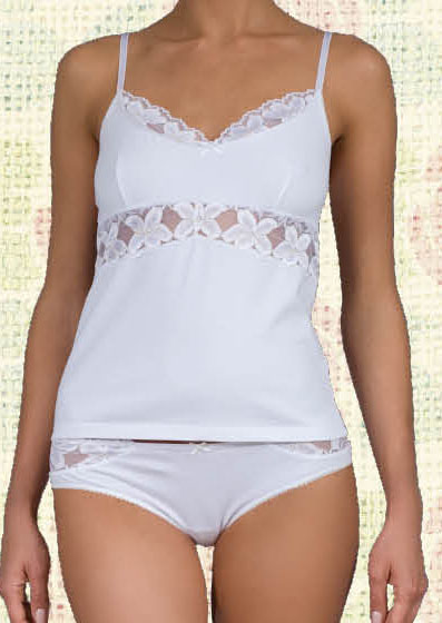 Элегантная майка на веревочках-бретельках, с V-образным вырезом отделанным ажурной окантовкой над грудью. На майке обозначена грудь, под грудью один шов. Под грудью добавлена вставка с кружевным рисунком.