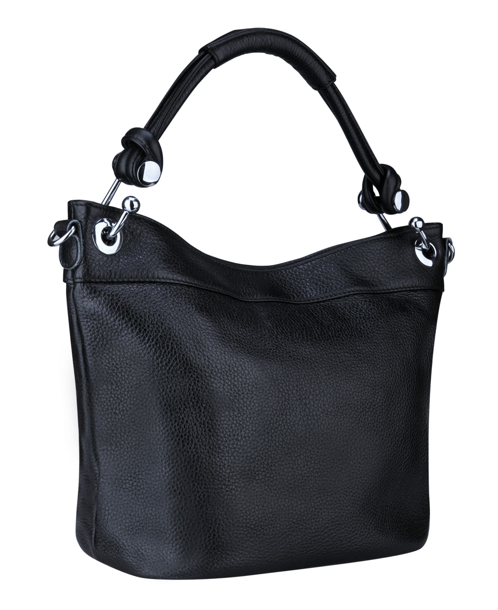 Абсолютно универсальная сумка из качественной натуральной кожи. Средний размер и стильная форма делает эту сумку подходящей и к деловому костюму и к нарядному платью. Оригинальная фурнитура придает сумке индивидуальности. Разъем ручек позволяет легко носить сумку на плече. Также есть длинный ремень, чтобы носить сумку через плечо. Цвет черный.