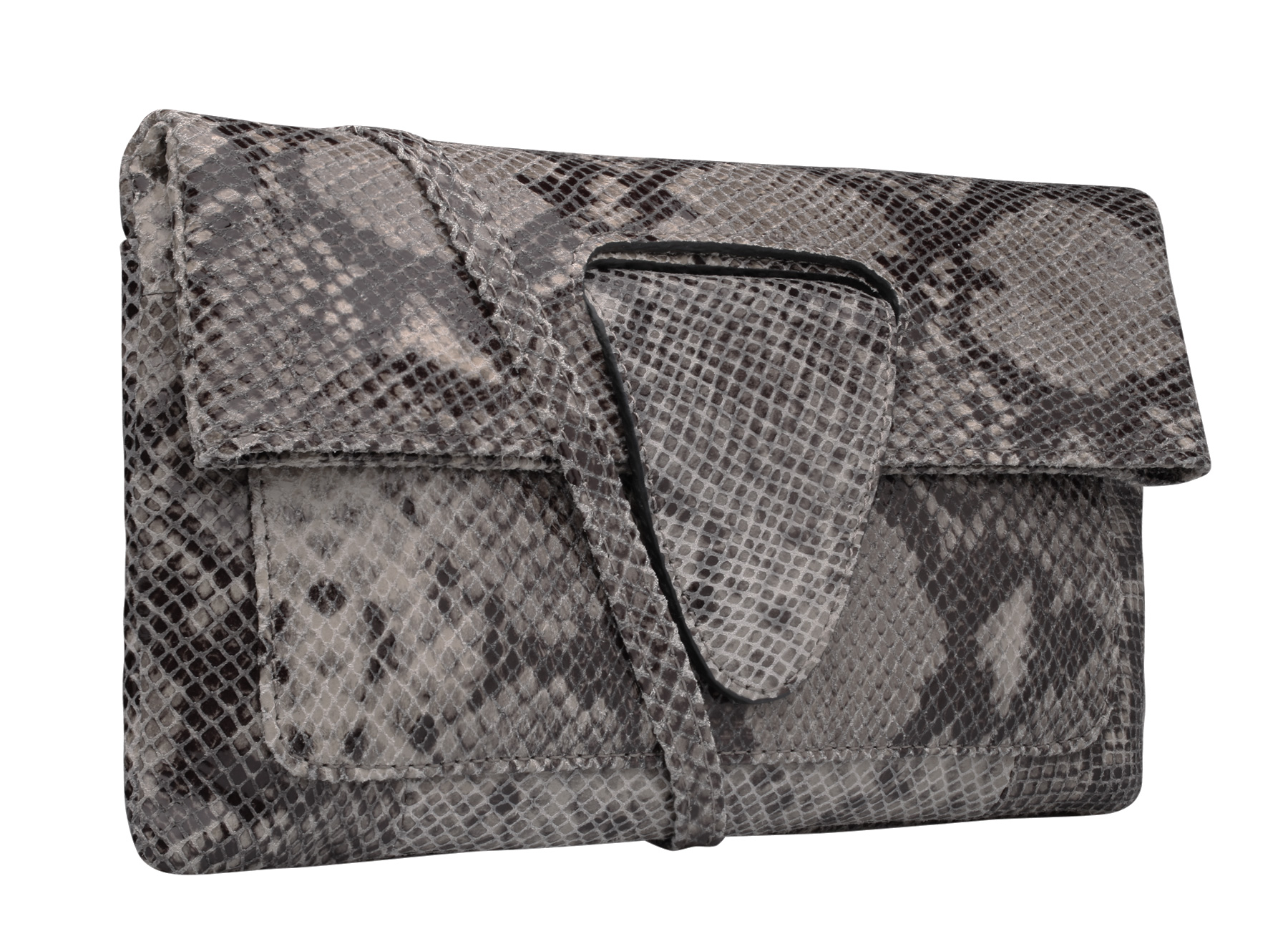 Оригинальный клатч из натуральной кожи, имитирующей кожу питона. Сумочка захлопывается и закрывается на магнит. Также ее можно носить в развернутом виде. Есть длинный кожаный ремешок, чтобы носить аксессуар через плечо.