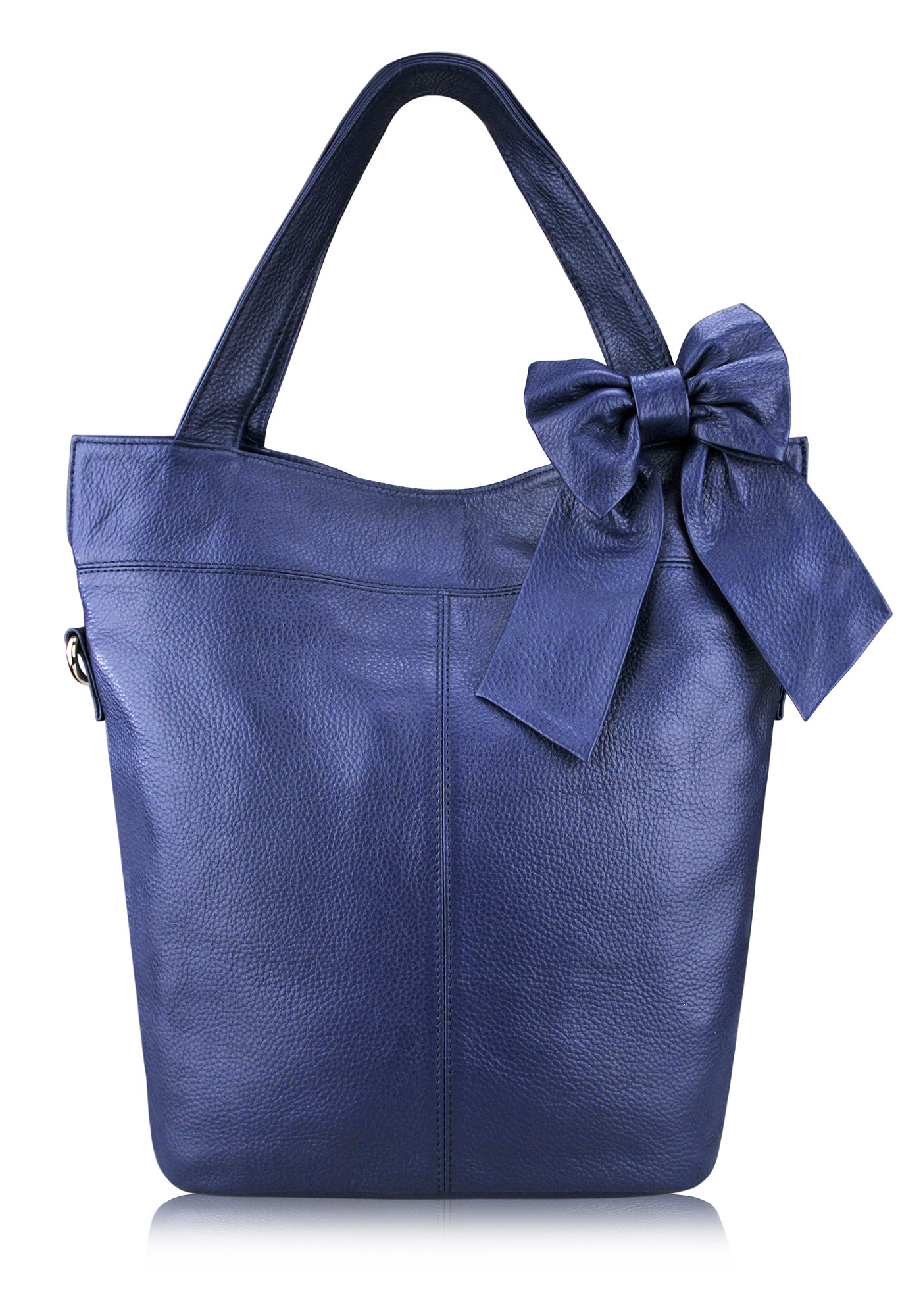 Очень позитивная сумка из натуральной кожи. Яркий цвет выделит ее хозяйку из толпы подарит хорошее настроение. Удобная форма, вмещает документы размера А4. Бант крепится на заклепку и при желании снимается. Также есть длинный ремень, чтобы носить сумку через плечо. Цвета: синий, черный, фуксия, белый, красный.