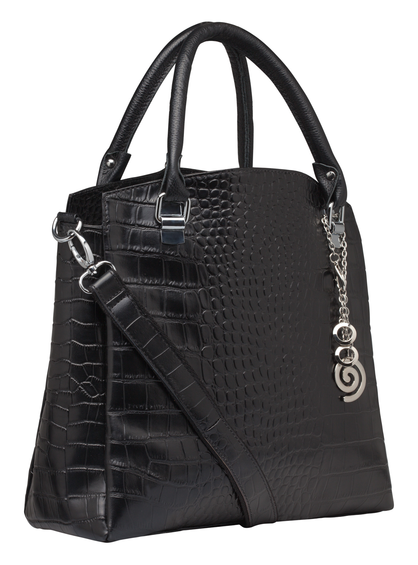 Женственная сумка из плотной натуральной кожи, имитирующей кожу крокодила. У этой модели очень удобный средний размер, вмещает формат А4 и при этом не выглядит большой. Большой плюс этой сумки в том, что она смотрится абсолютно уместно в будние дни в офисе, и в выходные на встрече с друзьями. Разъема ручек достаточно, чтобы носить сумку на плече.