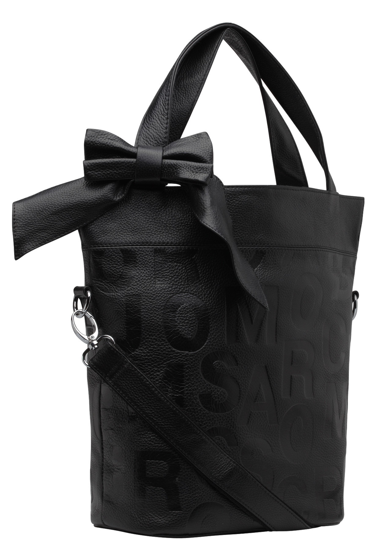 Очень позитивная сумка из натуральной кожи. Удобная форма, вмещает документы размера А4. Бант крепится на заклепку и при желании снимается. Также есть длинный ремень, чтобы носить сумку через плечо. Цвет черный. Также есть в белом и синем цветах.