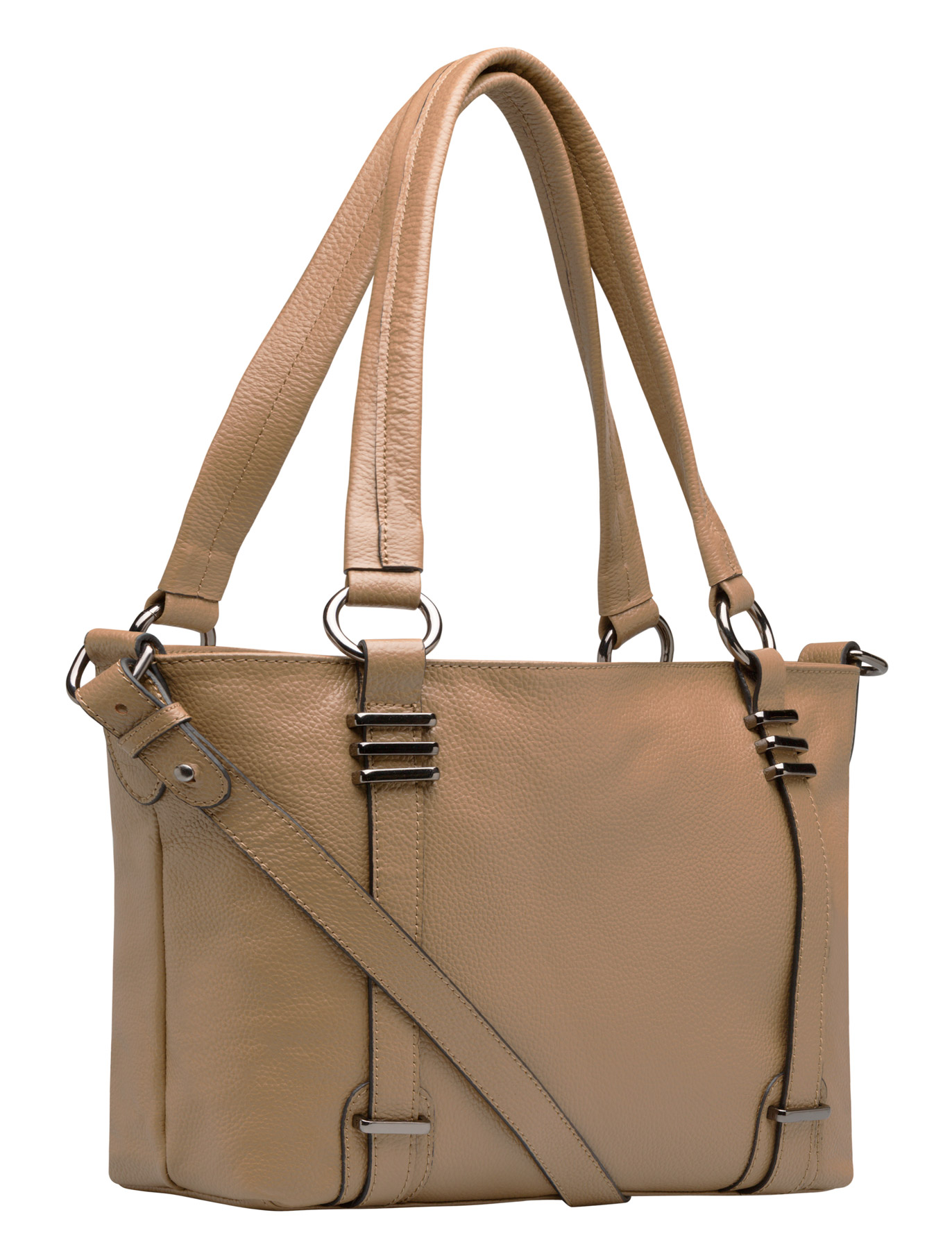 Абсолютно универсальная сумка из качественной натуральной кожи. Средний размер и стильная форма делает эту сумку подходящей и к деловому костюму и к нарядному платью. Оригинальная фурнитура придает сумке индивидуальности. Разъем ручек позволяет легко носить сумку на плече.