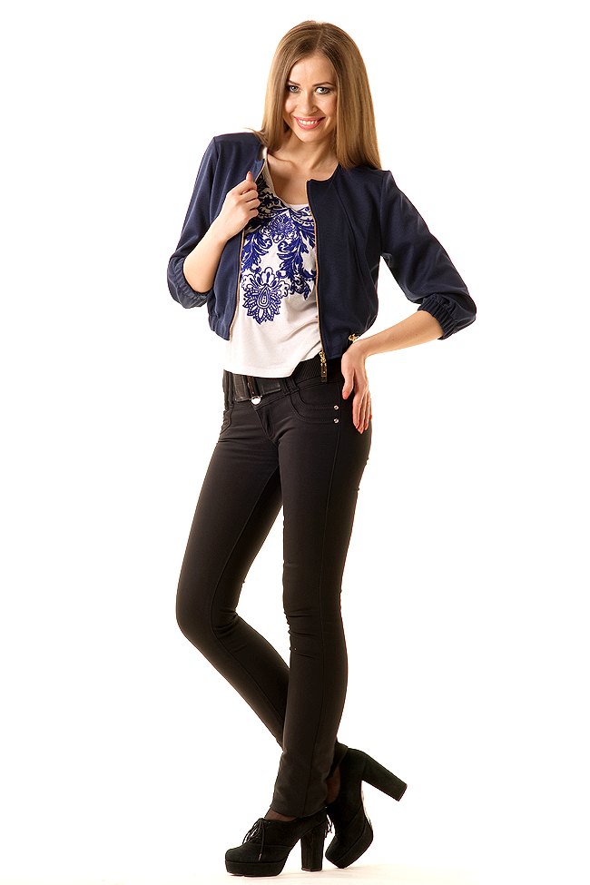 Материал: 35% вискоза, 35% коттон, 30% полиэстер. Короткий пиджак выполненный в т.синем цвете для настоящих модниц. Длина изделия около 49 см.