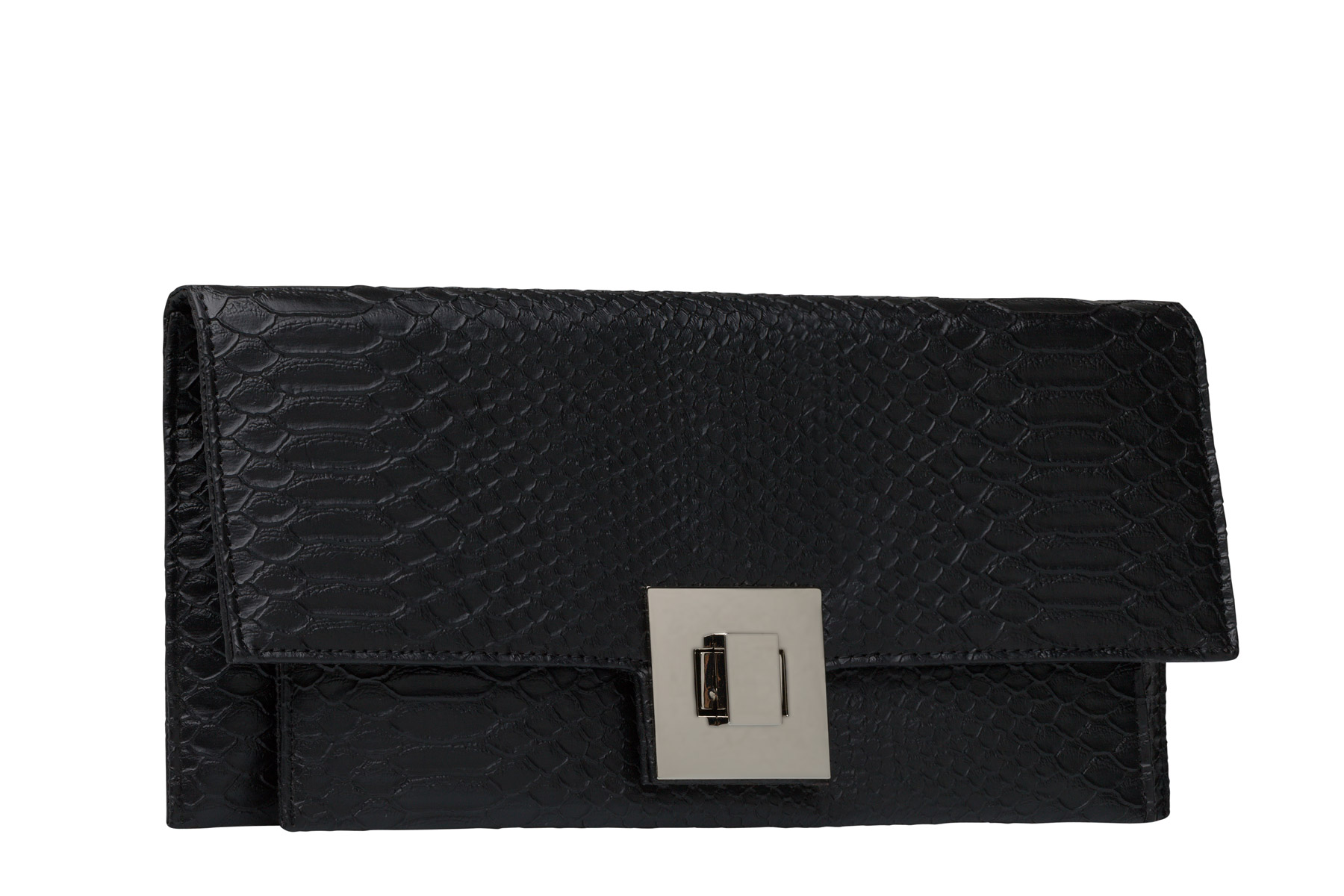 Стильный клатч с оригинальной застежкой. У аксессуара плотная форма, фактура имитирует кожу рептилии. Очень удобный размер, идеально вмещает все самое необходимое в течение дня. Также прекрасно подойдет для вечернего выхода.