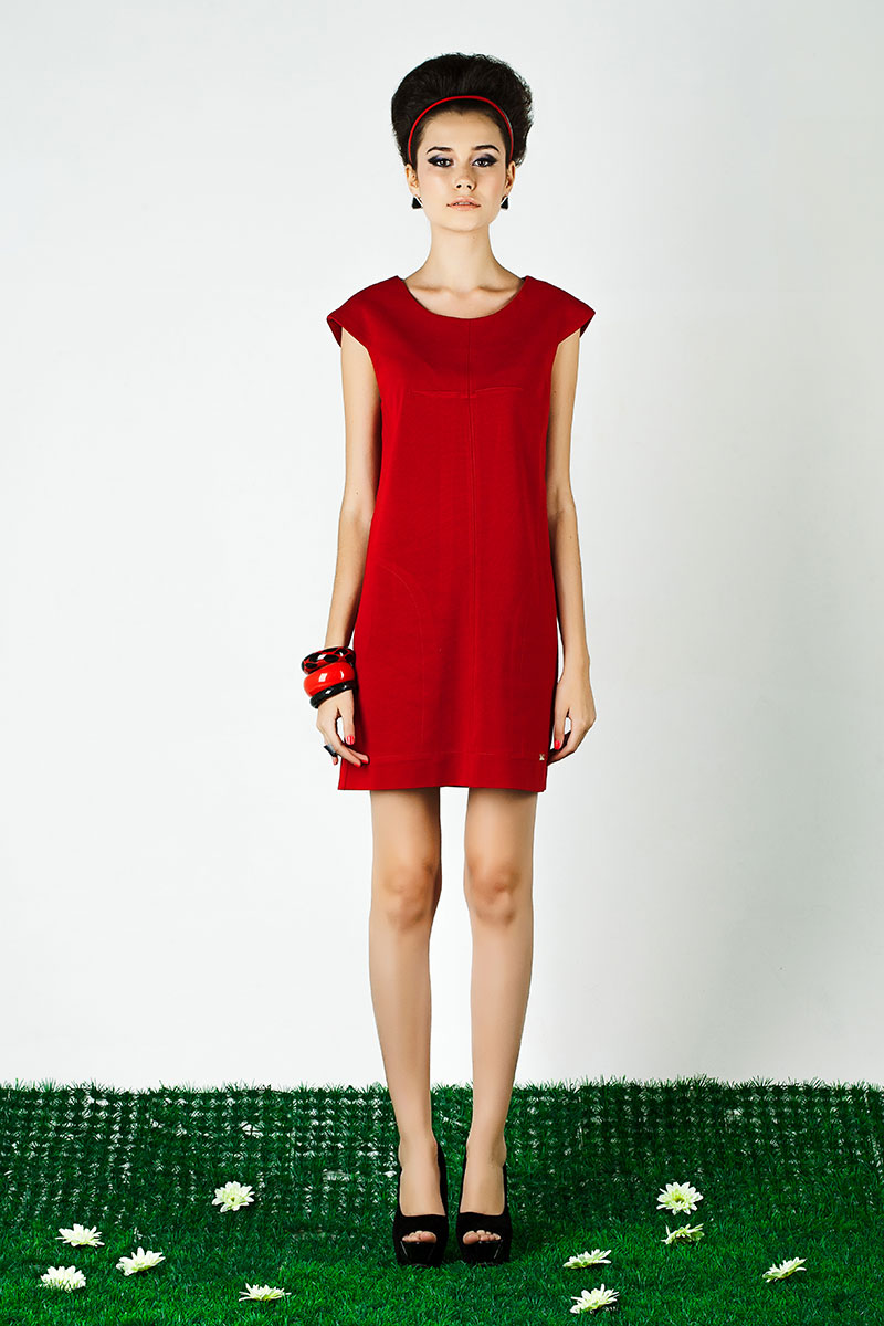 Материал: 35% вискоза, 35% коттон, 30% полиэстер. Трикотажное платье свободного покроя с отделочной отстрочкой по карманам и оригинальной выточкой в области груди. Выполнено в 2 цветах — красный и электрик. Длина изделия около 89 см.
