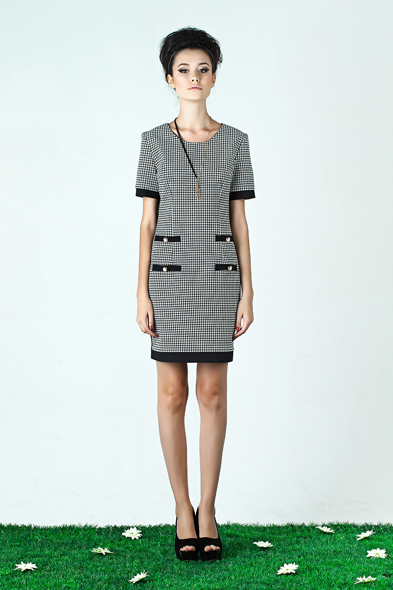 Платье актуальной модной расцветки «гусиные лапки» с имитацией карманов. Спинка однотонная с металлической молнией. Длина изделия около 87 см.