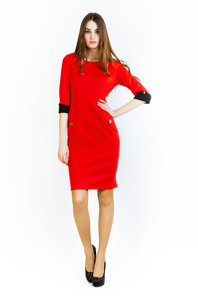 Трикотажное платье красного цвета с черной отделкой. Карманы с накладными клапанами на пуговице. По спинке разрез с отворотами, декорированный цепочкой и пуговицами.
